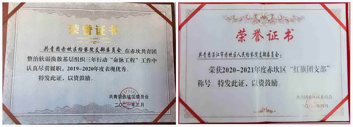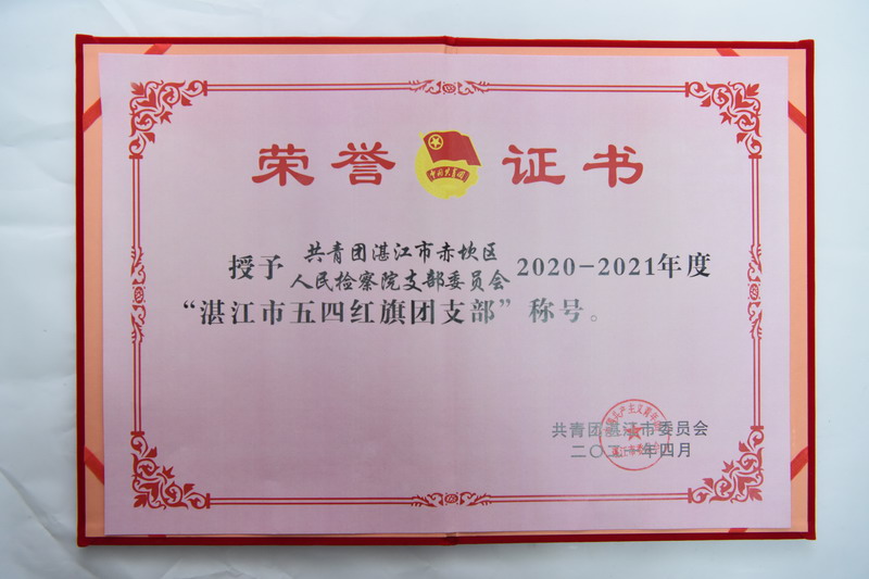 2021年4月,共青团湛江市委员会下发了《关于表彰2020-2021年度湛江市共青团优秀个人和优秀集体的决定》(团湛字[2021]17号),共青团赤坎区人民检察院支部委员会被共青团湛江市委员会授予2020-2021年度“湛江市五四红旗团支部”称号。